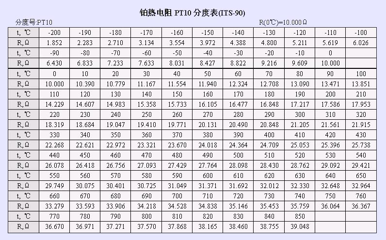 鉑熱電阻Pt10分度表