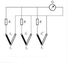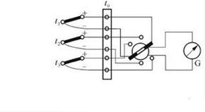 圖二是多個被測溫度用多個型號相同的熱電偶分別測量,多個熱電偶共用一臺顯示儀表,它們是通過多路轉(zhuǎn)換開關(guān)來進(jìn)行測溫點(diǎn)切換的。多點(diǎn)測溫電路用于自動巡回檢測中,按要求顯示各測點(diǎn)的溫度值,只需要一套顯示儀表和補(bǔ)償熱電偶。