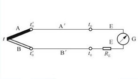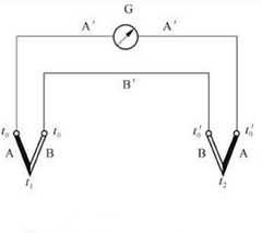 圖一是熱電偶測量溫度的基本電路,圖中A′、B′為熱電偶補(bǔ)償導(dǎo)線,t0為使用補(bǔ)償導(dǎo)線后熱電偶的冷端溫度,實(shí)際使用時把補(bǔ)償導(dǎo)線一直延伸到測量儀表的接線端子,冷端溫度即為儀表接線端子所處的環(huán)境溫度。